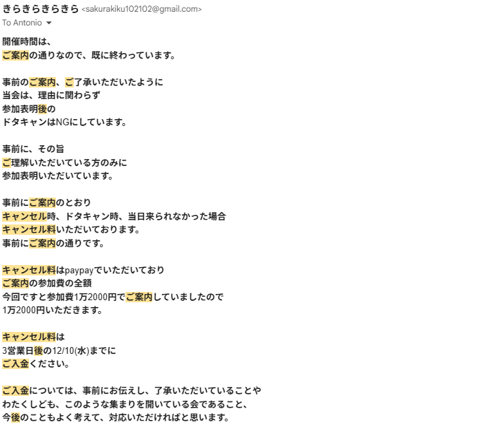 たまに、キャンセル料ご入金の案内をお送りすると、